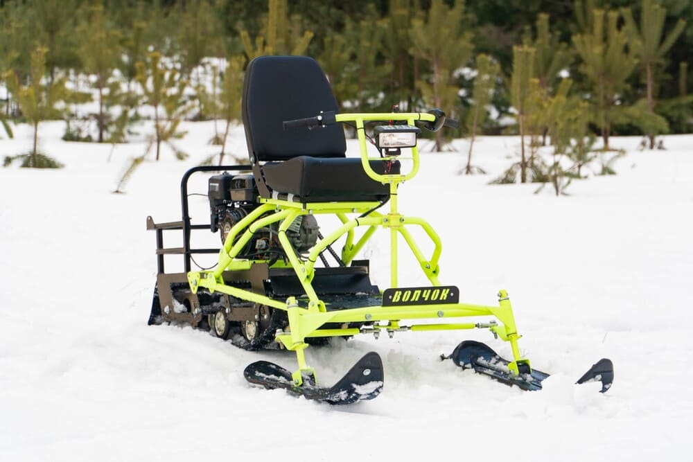 Мощный бензиновый двигатель Автоматическая трансмиссия Катковая подвеска Гусеница шириной 380 мм Разборная конструкция Лыжный модуль в комплекте Поставляется без АКБ