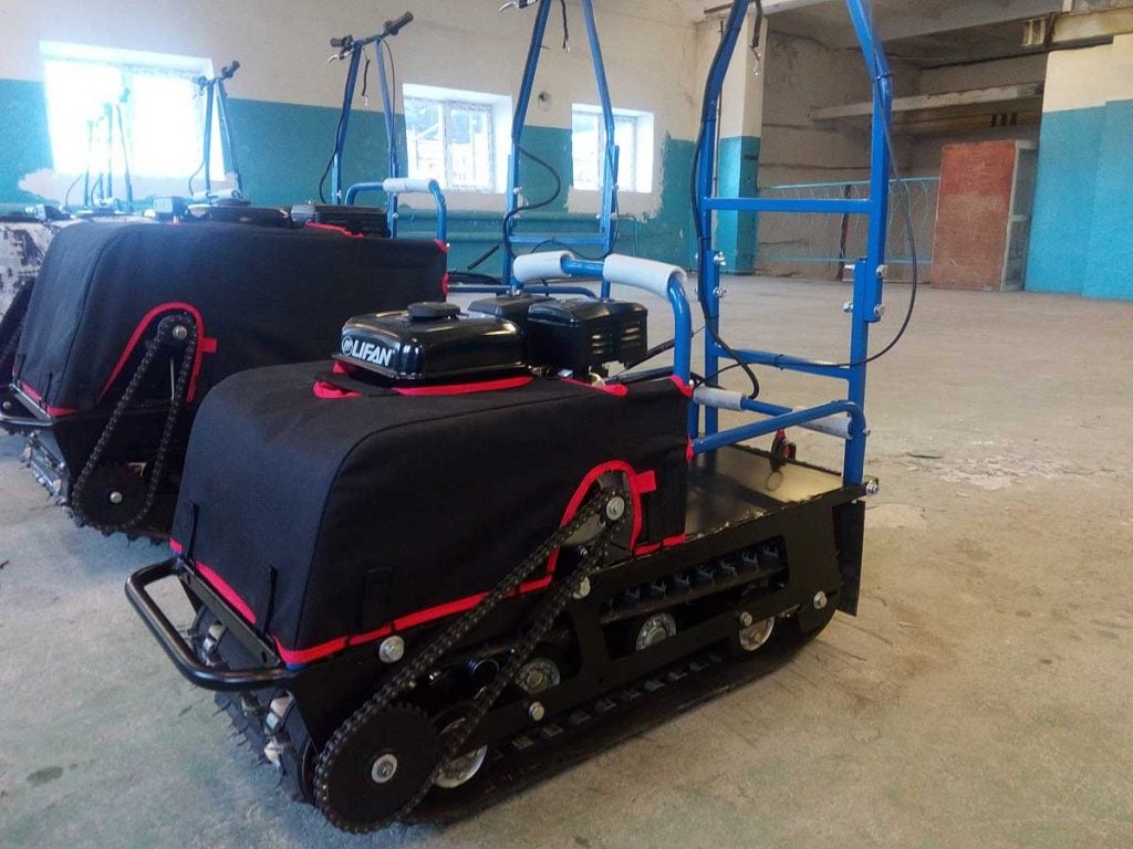 В конструкции мотовездехода используется цельная резиновая гусеница шириной 380 мм. Площадь опоры гусеницы улучшает тяговые характеристики, проходимость и устойчивость буксировщика.