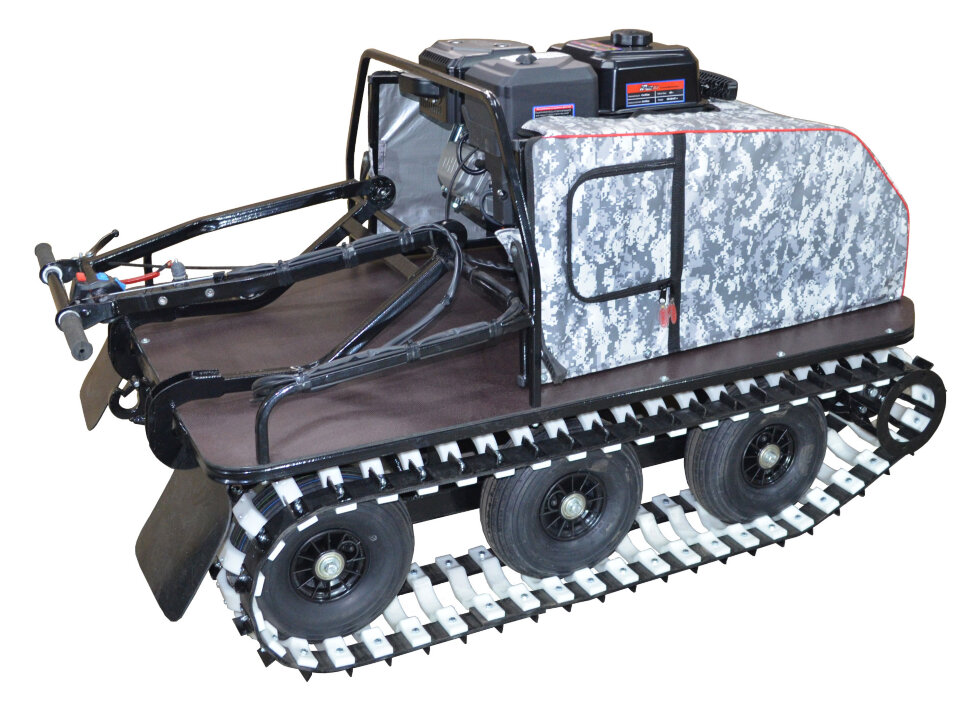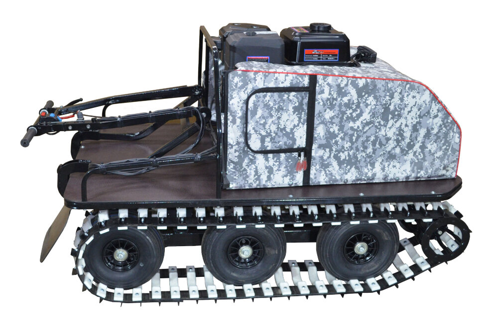 Мотособака весит 140 кг, а размер ее составляет 148 см в длину, 87 см в ширину и 90 см в высоту. Благодаря своей легкости и компактности, мотобуксировщик способен маневрировать и проходить по рыхлой и мягкой почве. К тому же мотобукс оснащен катковой подвеской, которая сглаживает ход, обеспечивает устойчивость на неровной поверхности, смягчает удары и вибрации от дороги.