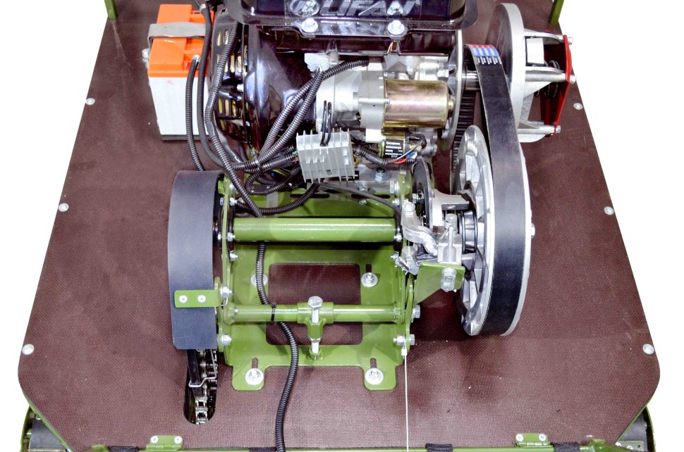 Мотособака оснащена 4 тактным мотором мощностью 15 лошадиных сил, что позволяет набирать скорость до 40 км/ч. Это максимальная скорость, которая позволит владельцу быстро перевезти груз 540 кг. Мотобуксировщик отличается экономным расходом топлива - потребляет всего 3 л бензина в час. Объем двигателя достигает 460 кубов, что значительно сказывается на мощности и производительности мотобукса.