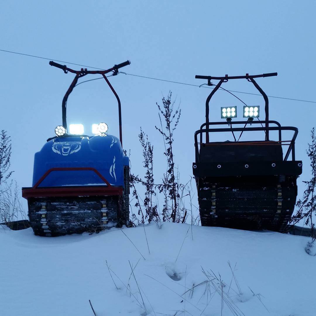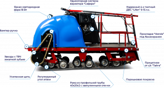 Мотособака весит 110 кг, а размер ее составляет 153 см в длину, 59 см в ширину и 84 см в высоту. Благодаря своей легкости и компактности, мотобуксировщик может маневрировать и проходить по рыхлой и мягкой почве. Кроме того, у мотобукса есть катковая подвеска, которая улучшает ход, обеспечивает устойчивость на неровной поверхности, а также смягчает удары и вибрации от дороги.