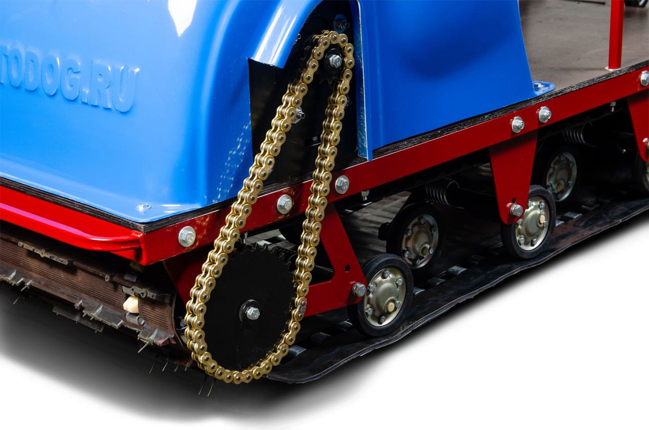На мотобуксировщике Мотодог установлен четырехтактный двигатель и передний привод, что обеспечивает надежную тягу. Конструкция включает в себя также устойчивую раму и место для размещения груза, оснащен рулевым управлением для удобства маневрирования, катковую подвеску и подпружиненные склизы.