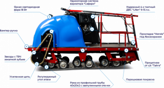 Мотособака весит 100 кг, а размер ее составляет 130 см в длину, 59 см в ширину и 84 см в высоту. Благодаря своей легкости и компактности, мотобуксировщик может маневрировать и проходить по рыхлой и мягкой почве. Кроме того, у мотобукса есть катковая подвеска, которая улучшает ход, обеспечивает устойчивость на неровной поверхности, а также смягчает удары и вибрации от дороги.