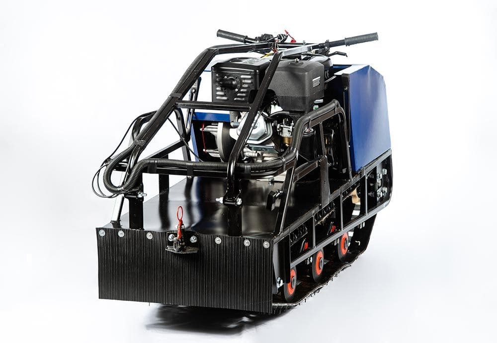 Увеличенный угол атаки позволяет с легкостью преодолевать глубокие снежные заносы. На ведущем валу мотобуксировщика установлены самоцентрующие подшипники. Смазка подшипника производиться без разборки ведущего вала и снят. Крепление руля вынесено выше платформы, что значительно повышает управляемость мотобуксировщика. Ширина руля средняя, что облегчает управление мотобуксировщиком в болоте и лесу. На мотобуксировщике установлен фаркоп. Это упрощает процесс крепления саней к мотобуксировщику, в отличии от стандартных прицепных устройств, где используется обычный рымболт.