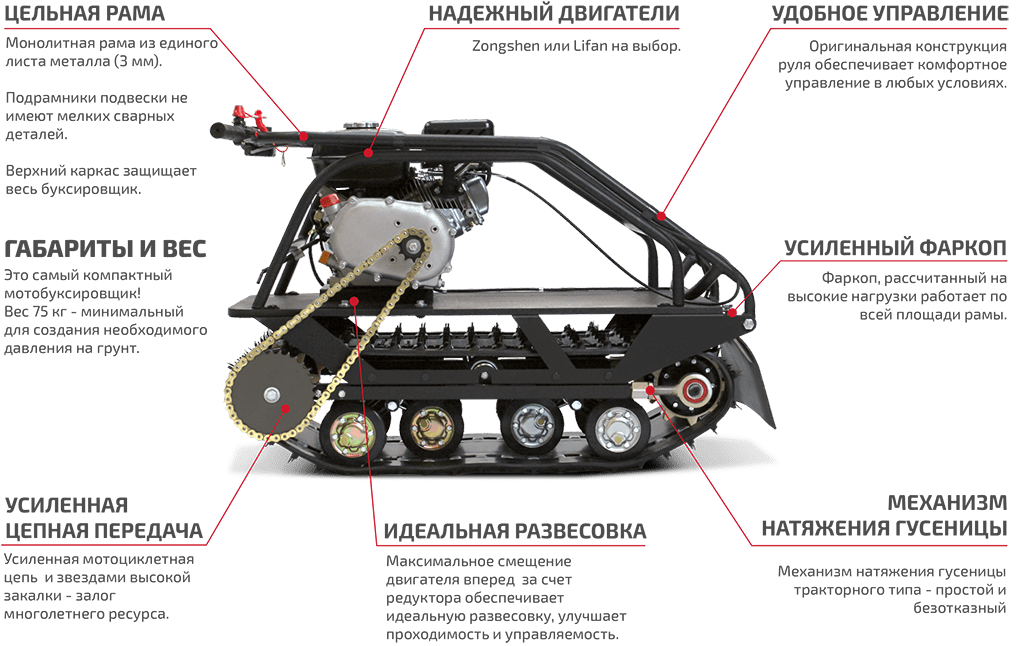 Мотобукс весит 80 кг, а размеры его составляют 100 см в длину, 43 см в ширину и 70 см в высоту. Модель оснащена гусеницей шириной 380 мм. Гусеница в сочетании с катковой подвеской способна проходить спокойно по льду и даже по территории без снега.