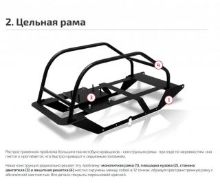 Основные агрегаты такие, как двигатель и трансмиссия крепятся не к площадке из фанеры или пластика, а непосредственно к монолитной раме. Первый слой — монолитная рама. Второй слой — ламинированная фанера. Третий слой — станина двигателя и вариатора и защитный каркас. Все три слоя прочно скручены в 12 точках, что создает абсолютно монолитную конструкцию.