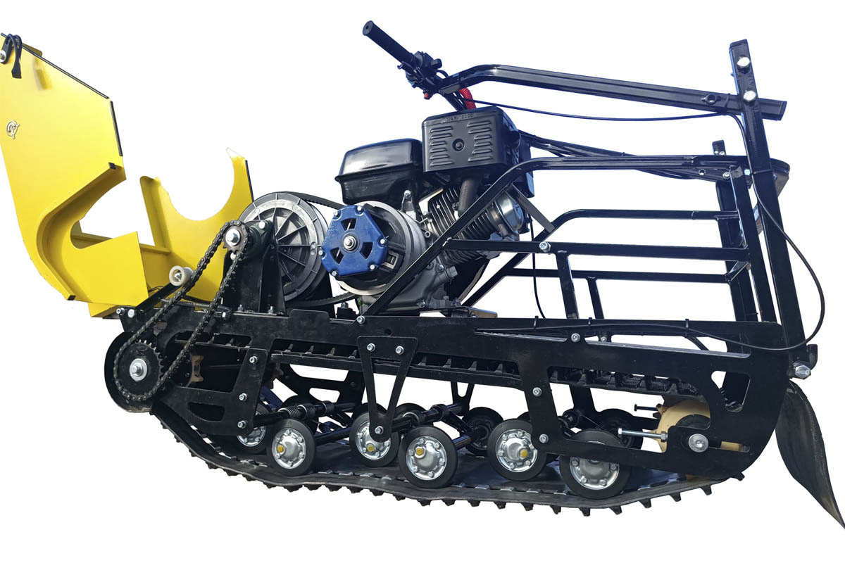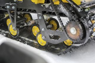 В конструкции мотовездехода используется цельная резиновая гусеница шириной 500 мм. Гусеница в сочетании с катковой подвеской способна проходить спокойно по льду и даже по территории без снега.