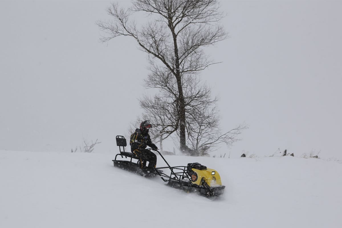 Буксировщик оснащен 4-х тактным двигателем мощностью 9 л. с., достигающий скорость до 40 км/ч. Это позволяет быстро перевозить груз до 300 кг в санях и на специальной багажной площадке мотобуксировщика. Объем двигателя составляет 270 кубов.