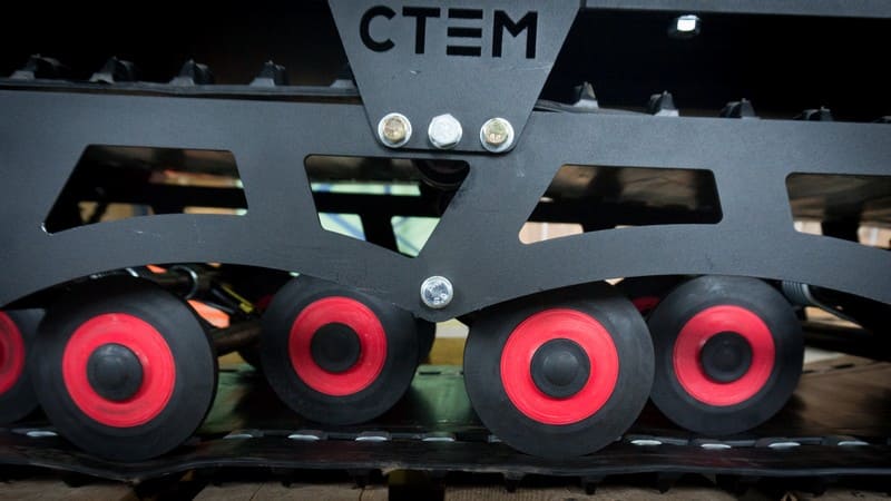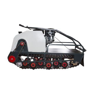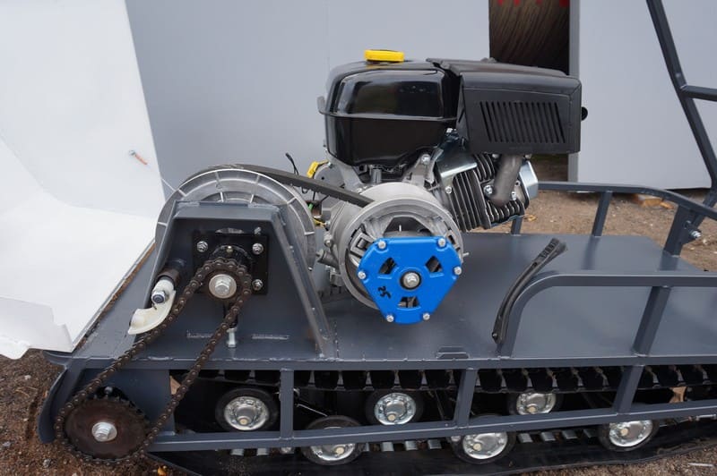 В конструкции мотовездехода используется цельная резиновая гусеница шириной 500 мм. Гусеница в сочетании с катковой подвеской способна проходить спокойно по льду и даже по территории без снега.