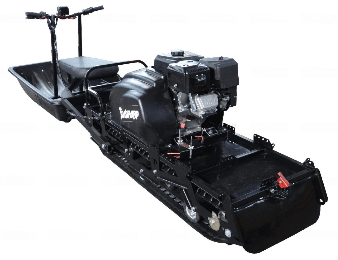 В конструкции мотовездехода используется цельная резиновая гусеница шириной 500 мм. Гусеница в сочетании с катковой подвеской способна проходить спокойно по льду и даже по территории без снега.