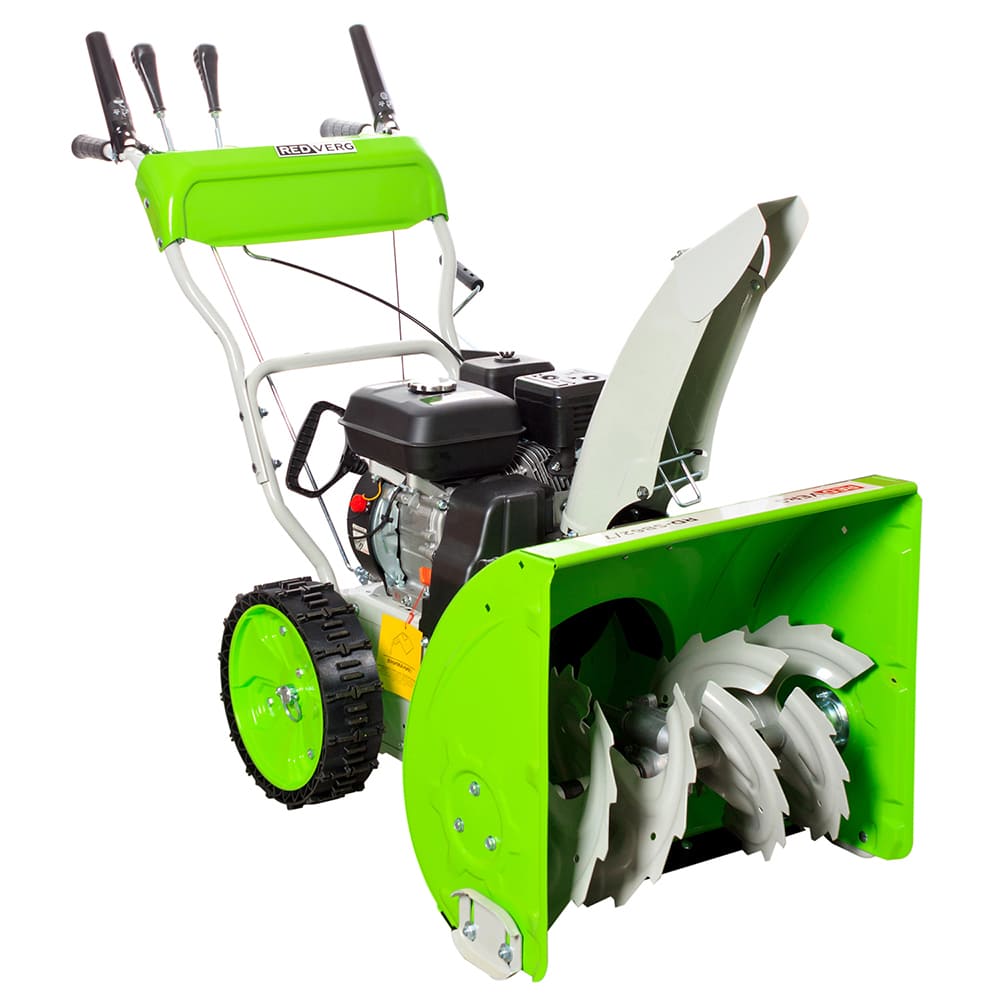 Самоходный снегоуборщик РедВерг оснащен бензиновым двигателем с воздушным охлаждением мощностью 7 лошадиных сил. Вместе с колесами с глубоким протектором, снегоуборочная техника легко перемещается, так как колеса предотвращают пробуксовку на обледенелых участках. Модель также оснащена датчиком уровня масла.